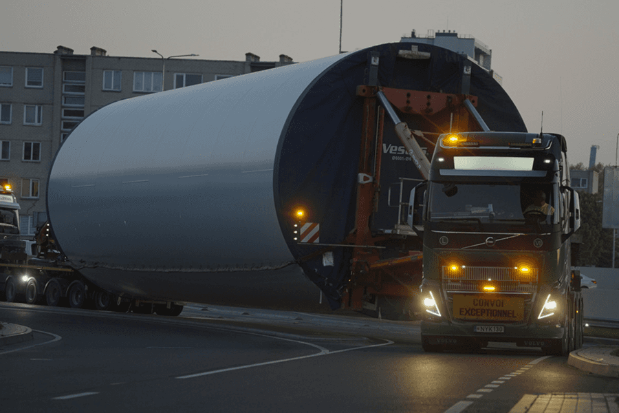 The components transported were the largest Vestas parts handled by Fulmenn to date, requiring an entirely new route design and development. This included widening turning areas, modifying existing infrastructure, and obtaining all necessary permits to ensure safe transportation. The route also passed through the city of Šiauliai, navigating the main streets to reach the project site.