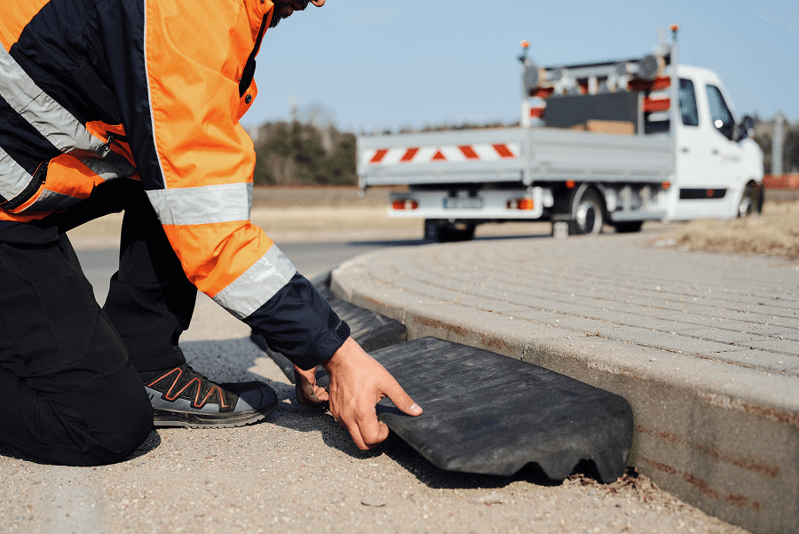 Laying plastic, composite, or metal plates, crane mats, rubber bumps.